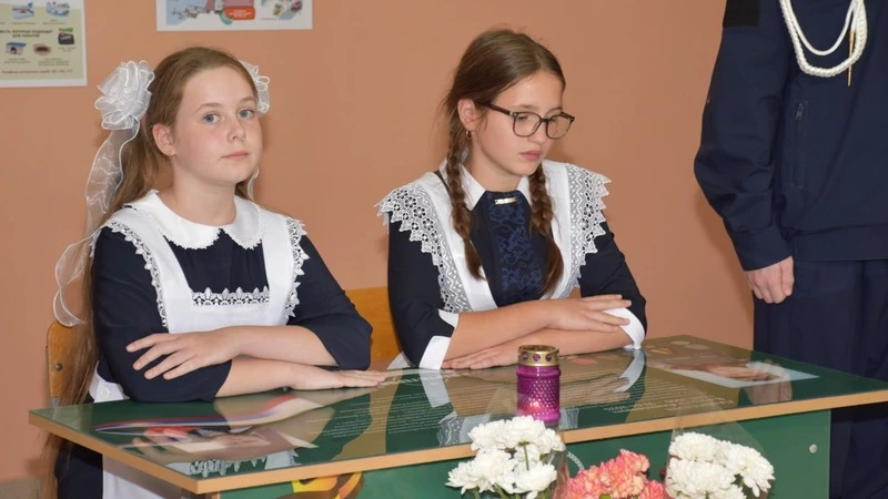 Право первыми сесть за парту героя было предоставлено учащимся 5 класса – Надежде Бережной и Полине Рыбальченко, достигшим высоких успехов в обучении.