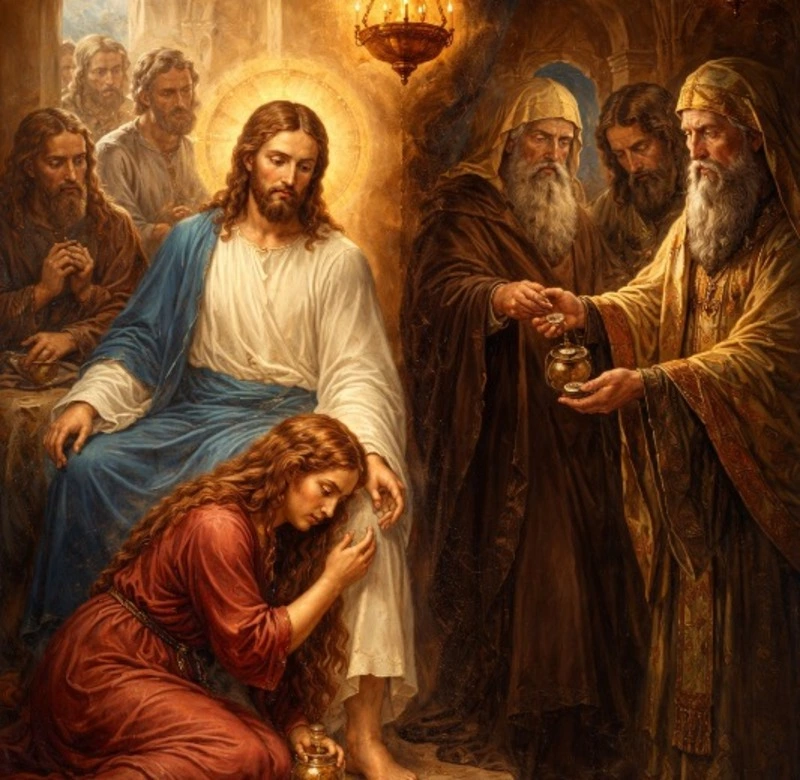 «Женщина, предавшаяся многим грехам», возлила драгоценное миро на главу Спасителя, отирая слезами и своими волосами Его ноги. В тот же час в душе Иуды Искариота, одного из двенадцати ближайших учеников, созрело преступное намерение — пойти к первосвященникам и предать Учителя за тридцать сребреников.