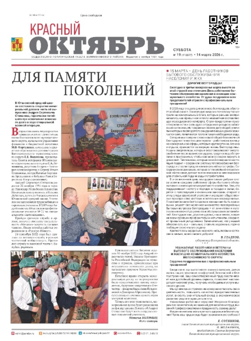 Газета Красный Октябрь №19 от 14 марта 2026 года