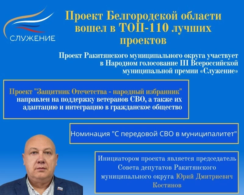По итогам Экспертного отбора проект Ракитянского муниципального округа «Защитник Отечества – народный избранник», инициатором которого стал председатель Совета депутатов Ракитянского муниципального округа Юрий Дмитриевич Костинов, вошел в ТОП-110 и представлен на этапе Народного голосования.