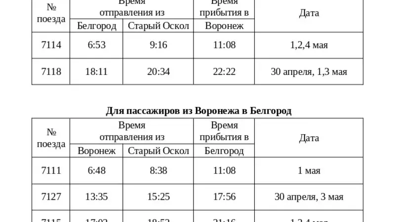 Белгородский минтранс сообщил о графике движения поездов в Воронеж на майские праздники. Подробностями поделились на официальной странице Министерства в соцсети «ВКонтакте».